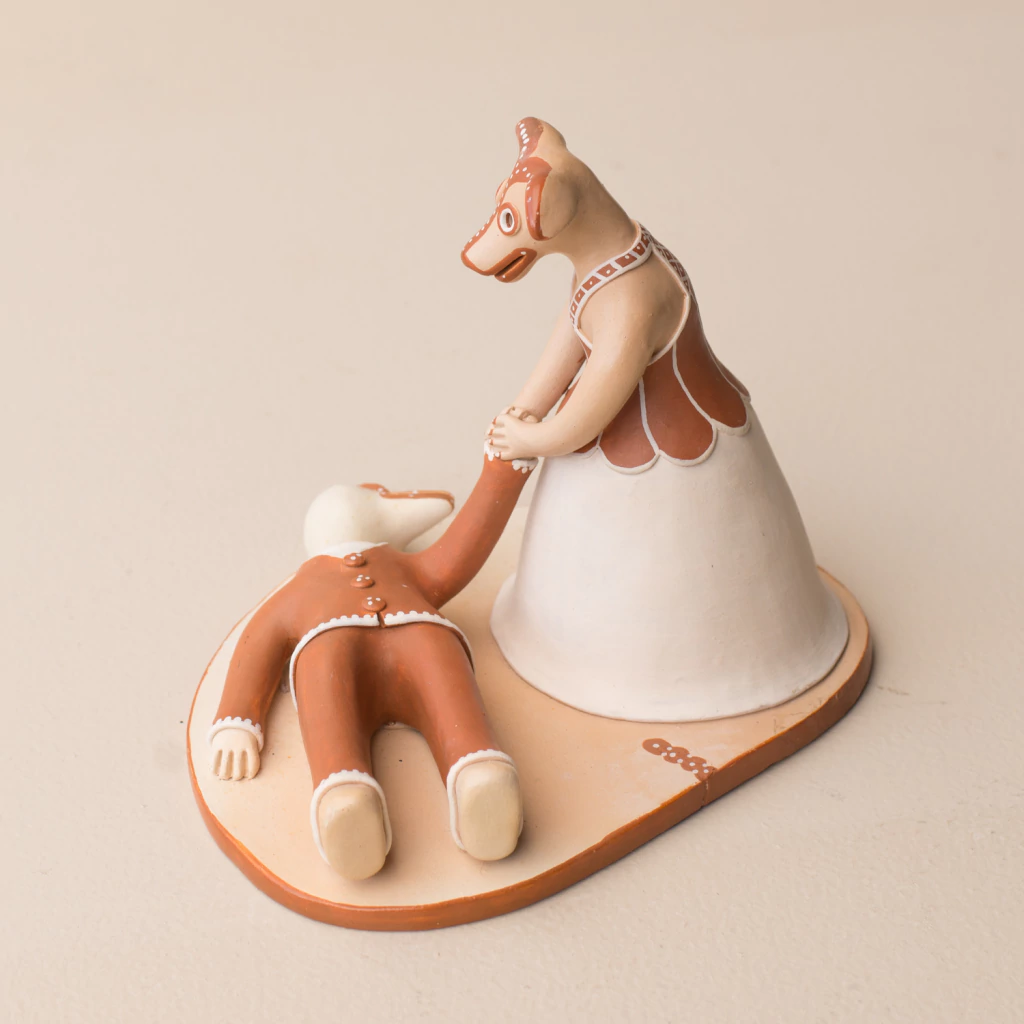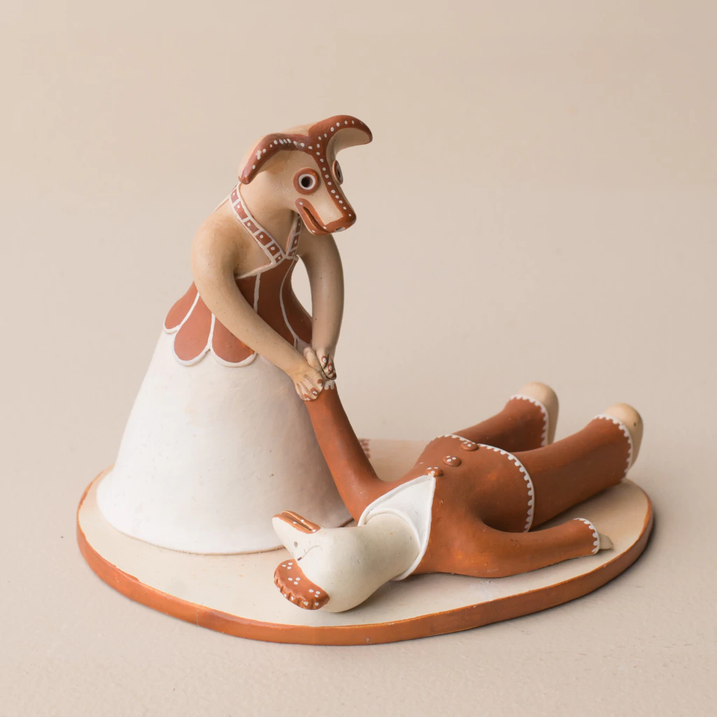 Suas esculturas antropomórficas retratam cenas do cotidiano, sempre carregadas de magia, afeto e identidade cultural. Cada peça é moldada à mão, mantendo viva a tradição feminina do Vale, onde o barro é mais do que matéria-prima: é meio de expressão, sustento e resistência.